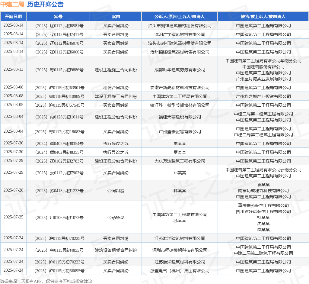 本站消息,根据天眼查APP显示,近日公布了一则中国建筑第二工程局有限公司作为被告/被上诉人的开庭公告,详细内容如下: